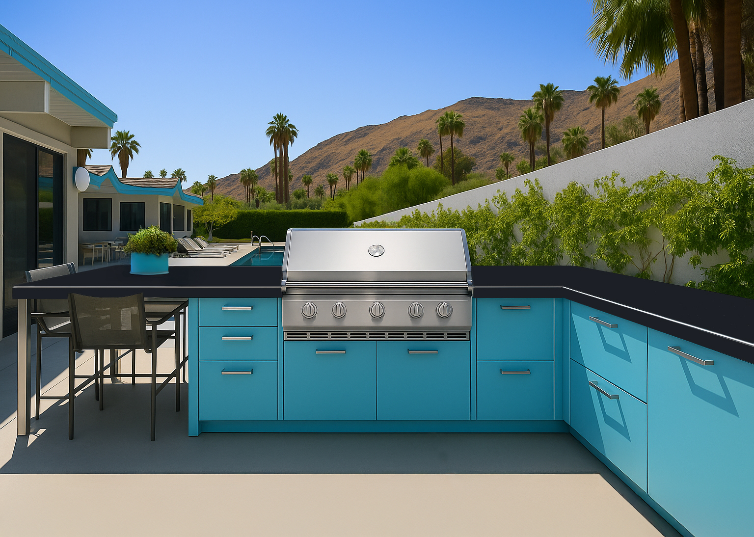 Modern lines, bold color, and stainless-steel precision come together for the ultimate poolside grilling experience.